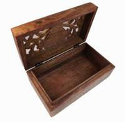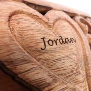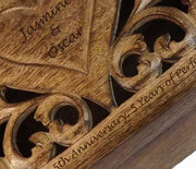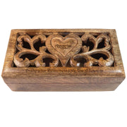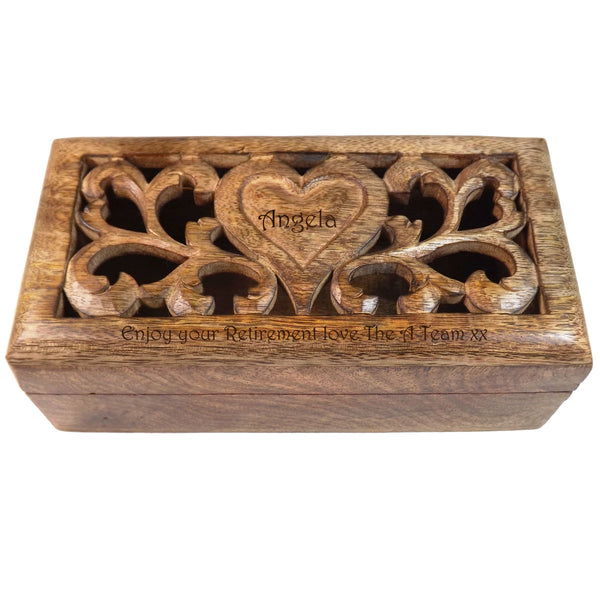 Solid hardwood box with decorative carved lid and a heart for your personalisation. A stylish box for storage with a great "woody" feel, ideal for jewellery, keepsakes or even load it with chocolate.