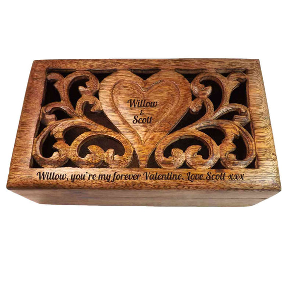 These hand carved boxes made from sustainable Mango Wood have a high wax finish and make a fabulous gift for Valentine's Day. Personalise the heart with a name, names, or initials. Plus, a line of text on the bottom of the lid for that heart felt message or maybe just a date.