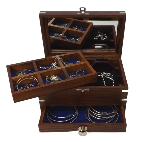 This elegant Jewellery box is made of solid Rosewood with polished aluminium inlays. It includes a mirrored lid, pull-out drawer and a removable tray which reveals another storage section underneath, making it the perfect place for storing those precious accessories and special memories, a timeless gender neutral 5th Anniversary gift.