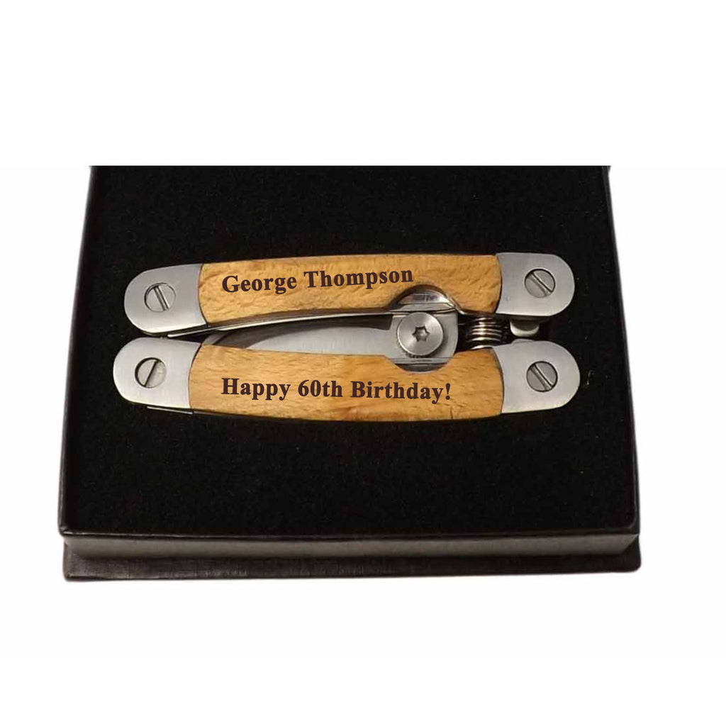 Effortlessly tackle all your gardening needs with our Personalised 5 in 1 Garden Multi Tool. This unique 5th Anniversary gift includes secateurs, wood saw, garden blade, and two types of weed removers, all conveniently foldable for storage and safety. The engraved personalisation adds a special touch. Perfect for gardening enthusiasts, comes in black presentation box with a magnetic catch and free canvas bag.