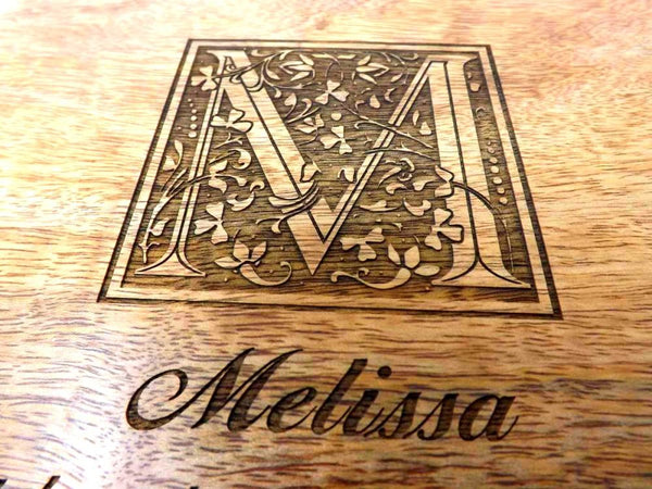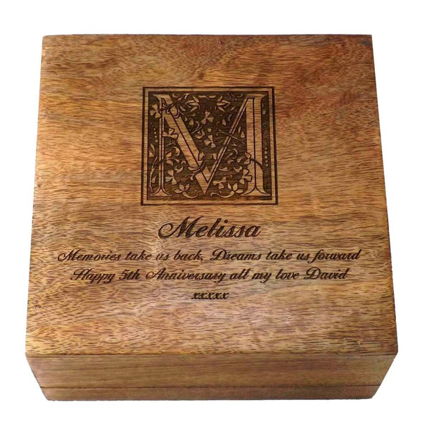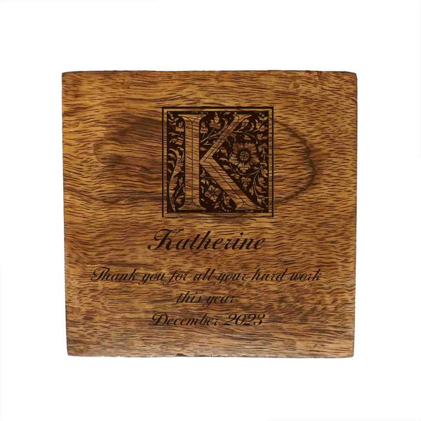 This hand finished, hinged box, is made from solid sustainable Mango Wood with a wax finish and makes a superb practical gift for all occasions. Personalise it with our professionally engraved initial in our Wood Block font with the recipient’s name underneath. We will use the first letter of the name for the main initial. You then have from three to four lines (depending on the size you choose) of text to get your message across below the name.