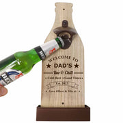 Bottle shaped wooden beer bottle opener with cap tray, a practical Father's Day gift. Your choice of names or message are laser engraved onto the front or we have other designs here where you can just add a few line. A great way to get your name or message across to Dad when so many people will be visiting it this summer.